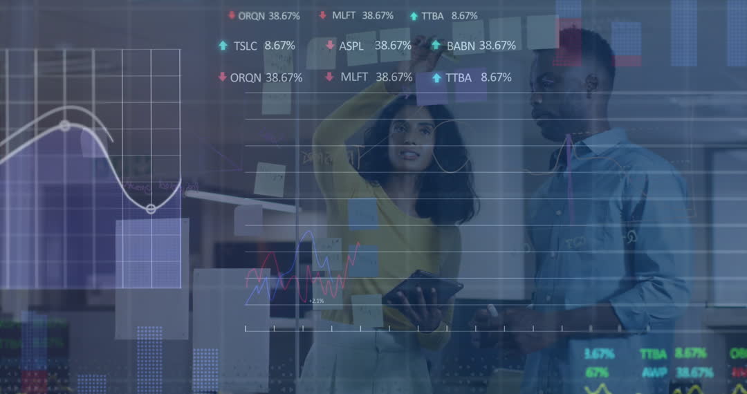 People employing technology in office, analyzing stock market trends for decision-making and strategy planning. Useful for depicting themes of modern workplace collaboration, business intelligence, and financial markets strategy discussions.