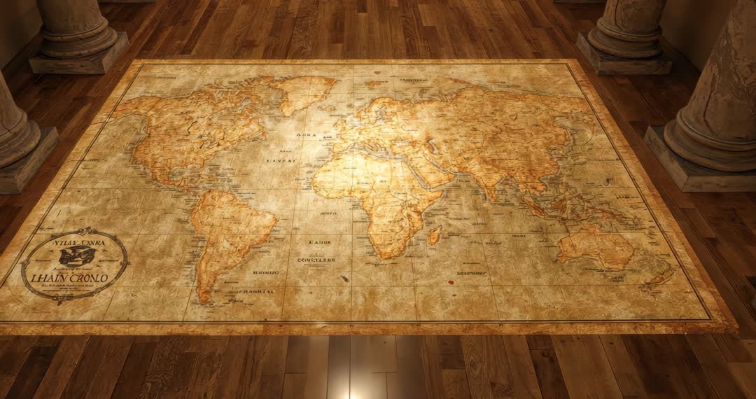 AI Generated Image. Video captures exquisite descent onto richly detailed antique world map bordered by ornate columns on polished wood flooring. Retro aesthetic evokes themes of heritage and discovery, perfect for educational videos on history or culture. Inspirational for interior designers drawing on vintage elements or creating historically themed spaces.