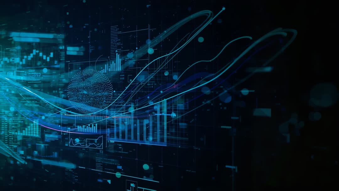 AI Generated Video. Showing neon cyan data waves flowing across dark HUD with rising bar charts, line graphs, digitized globe, and floating data points. Featuring smooth motion ideal for looping video backgrounds, title intros, and dashboard demos. Serving fintech, SaaS, AI, big data, cybersecurity, and analytics branding, corporate presentations, explainer videos, web hero banners. Color palette emphasizing cyan, teal, deep blue, black for high-contrast neon look. Recommended usage includes 10-30 second loops, 16:9 crop, lower-third overlays, motion graphic transitions, and background for data-driven narratives. Layering options include logo reveal, headline text, animated data overlays, and color grading to match brand guidelines. Supplying clear focal point with pulsing orb and rising bars to guide viewer attention and reinforce data storytelling.