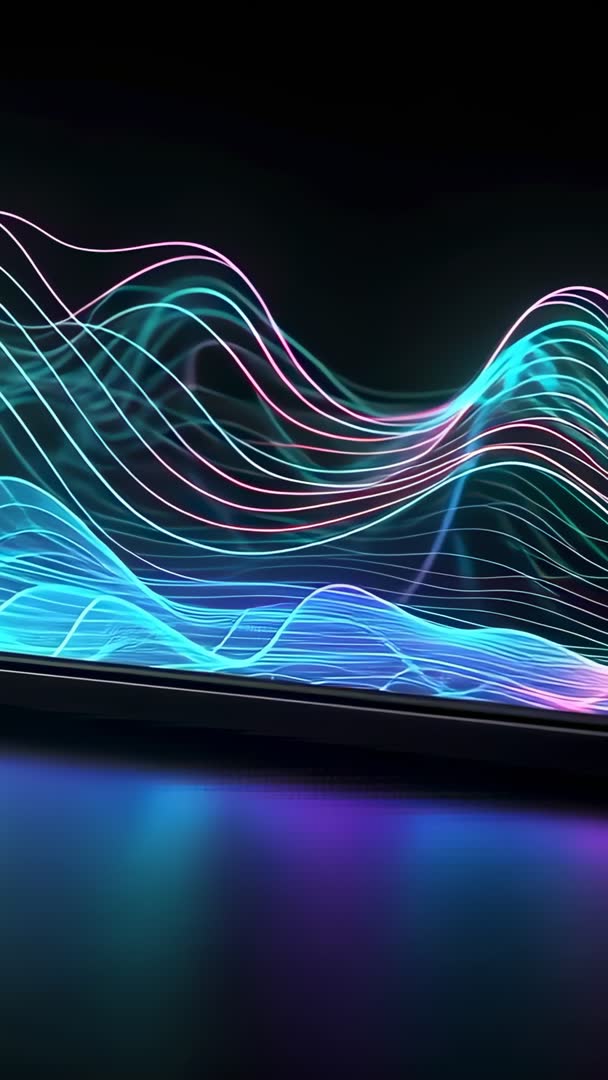 - Streaming neon waveform rising from device edge, pulsing across dark void vertical video