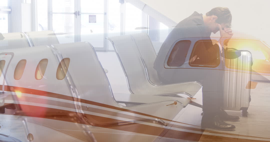Stressed Businessman at Airport with Jet Overlay Video