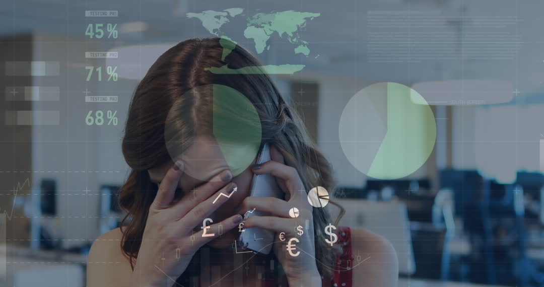 Businesswoman appears stressed while on the phone with digital graphics and currency symbols overlay. Image depicts financial stress and technology integration, useful for illustrating topics in global finance, data analytics, economic stress, and modern business communication.