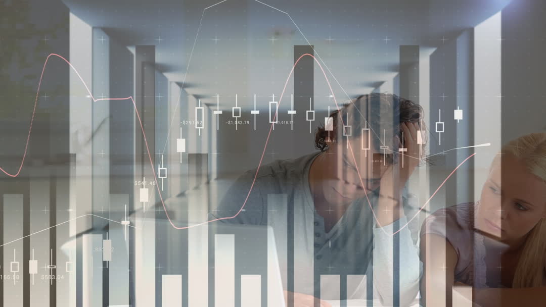This visual portrays two colleagues reviewing stock market data, overlaid with financial graphs and charts. The video conveys stress and concentration in a professional office environment, emphasizing the complexity and intensity of financial analysis. Ideal for illustrating topics related to business analytics, financial markets, economic strategy, or teamwork in professional scenarios.