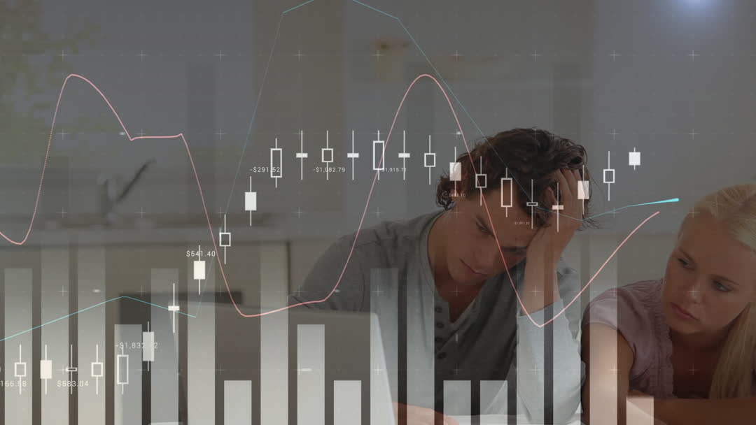 An video depicting a couple experiencing stress while managing home finances on a computer. Digital overlays of graphs symbolize debt and financial challenges. This is ideal for illustrating articles on budgeting, financial planning, and household management strategies in modern digital contexts.