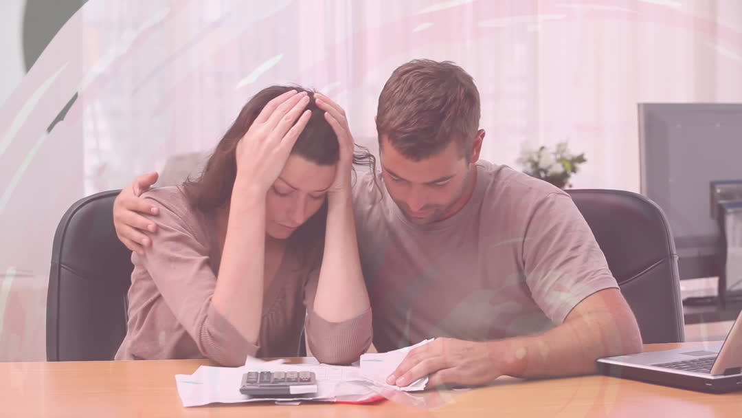 Young couple appearing stressed while reviewing bills at home, showcasing financial struggles. Transparent overlay animation represents global financial challenges. Useful for illustrating concepts of budgeting, financial planning, economic stress or debt management in articles or educational materials dedicated to personal finance solutions.