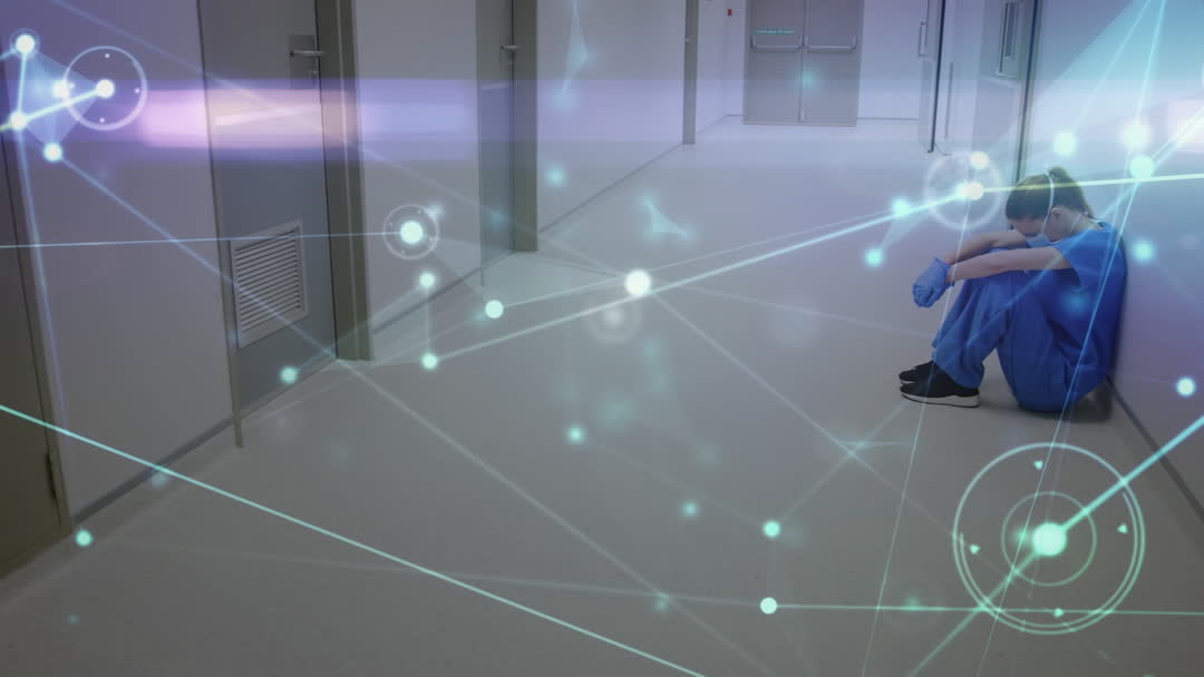 Healthcare worker experiencing stress sitting in hospital corridor with digital network overlay. Depicts intersection of technology and medicine. Useful for illustrating medical challenges, technological advancements, virtual reality in healthcare, or work pressure in medical professions.
