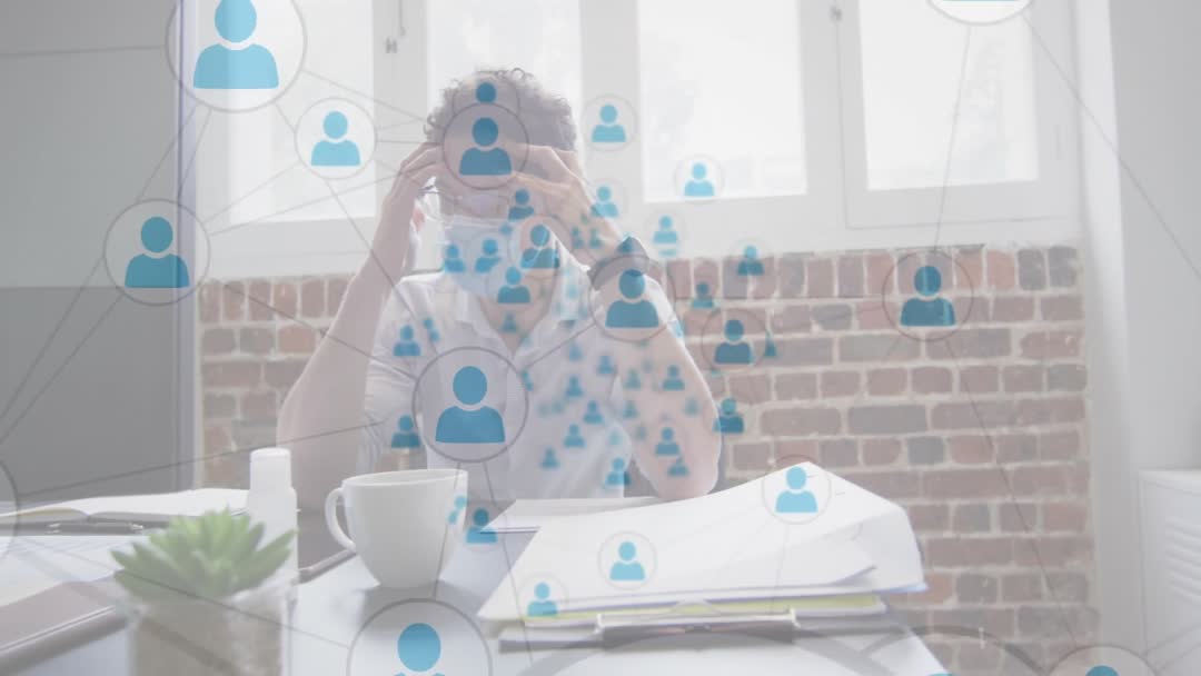 Business person wearing a mask looking stressed at their computer in a modern office. Futuristic user network icons suggest collaboration in a digital world. Use for concepts of digital networking, remote work stress, modern work environment challenges, and technological innovations.