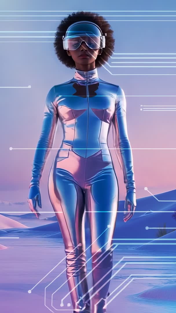 - Striding through neon dusk in reflective cyber suit with AR overlays | Vertical sci-fi
