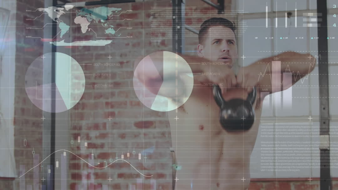Strong and muscular man lifting a kettlebell with digital data and graphs overlayed. This dynamic composition blends physical training with technological elements, illustrating the concept of data-driven fitness. Useful for promotions relating to modern workout programs, fitness technology, or connectivity in sports analytics.