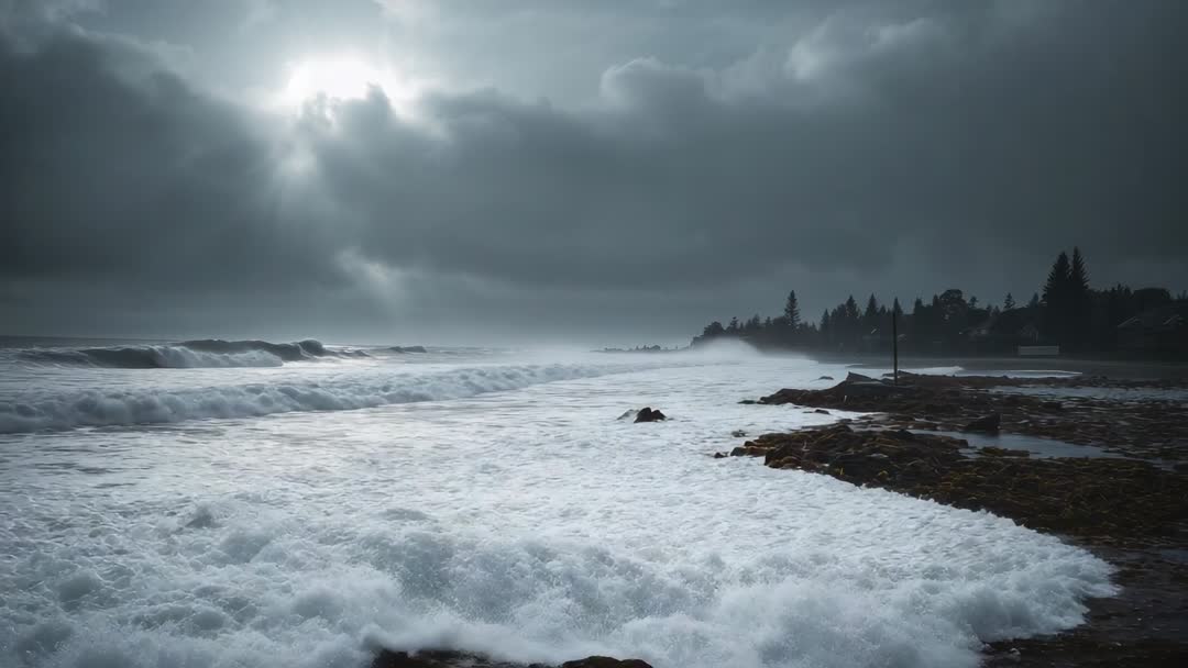 AI Generated Image. Dark storm clouds loom over a coast as strong winds push ocean waves against a rocky outcrop, creating an intense display of nature’s energy. Pine trees and houses line the distant shore, offering a stark contrast to the wild sea beneath a heavy sky. Ideal for illustrating weather phenomena, environmental impact studies, coastal landscape themes, or dramatic nature scenes. The video captures the essence of stormy seas, perfect for lessons on natural forces or presentations on marine environments.