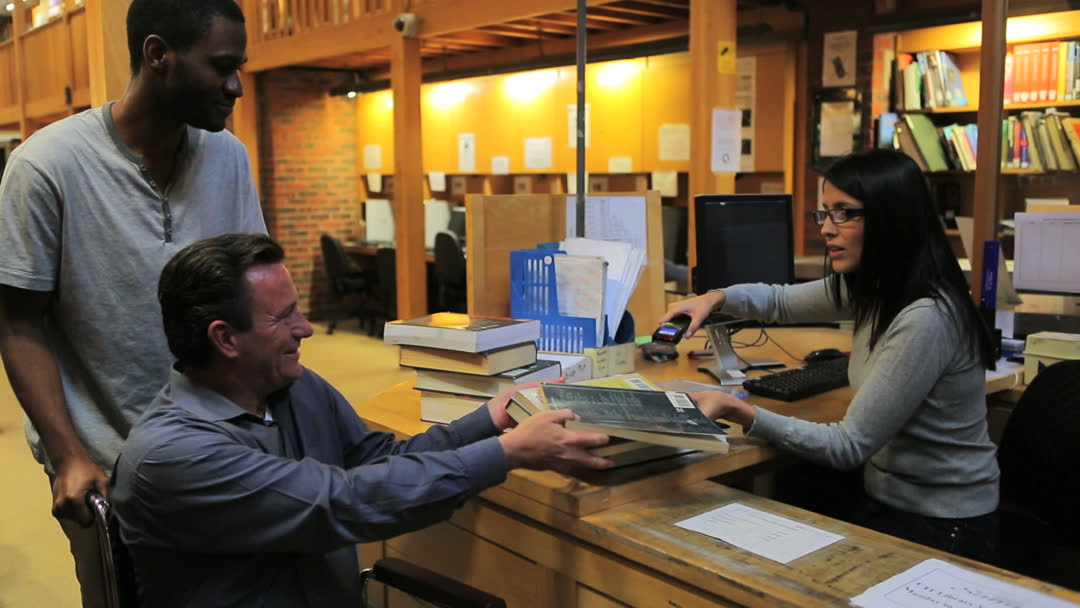 A male student is assisting his peer in a wheelchair to check out books at the library's front desk. This scene is ideal for portraying inclusivity, student life, and campus facilities. Useful for educational materials, diversity promotions, or publications on accessibility.