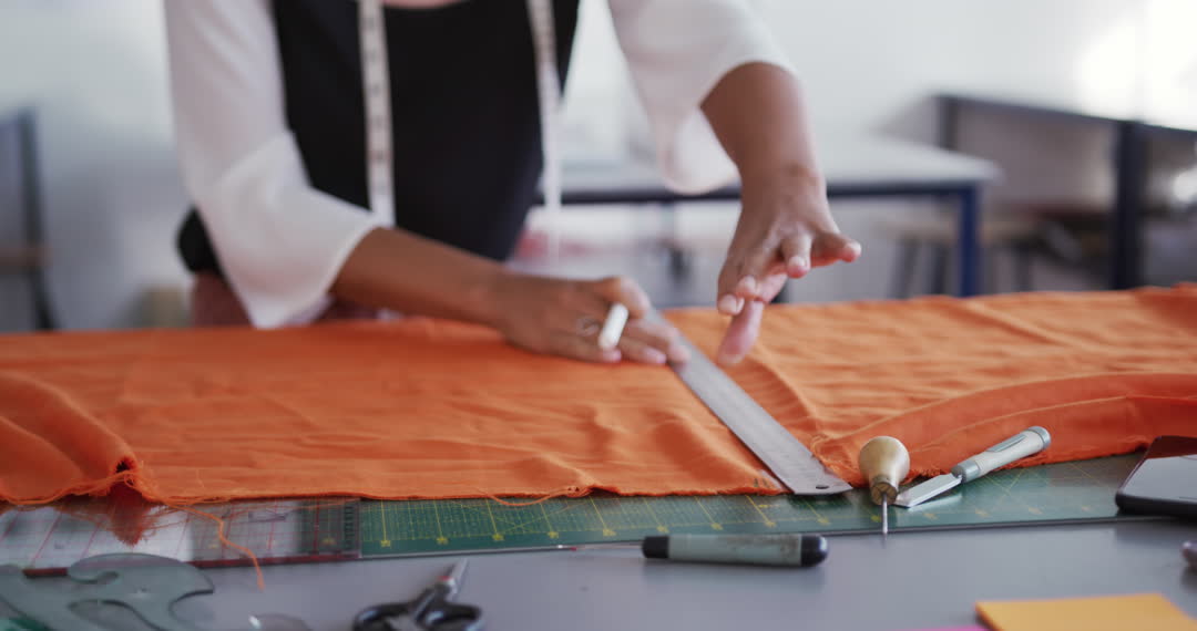 Front view of student working on a fashion design in bright, modern studio. Person using ruler and white chalk on orange fabric, creating vivid and vibrant creative atmosphere, ideal for education and artistic contexts. Variety of sewing tools around suggest desktop work environment and process-focused learning, showcasing educational or DIY curricula's focus on hands-on skills and creativity development.