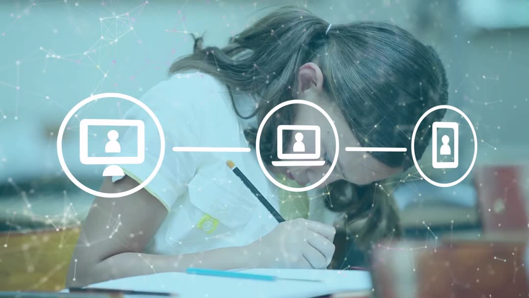 A young girl is focused on writing in her notebook while seated in a classroom, with virtual icons representing connectivity and digital devices superimposed. This visual symbolizes the intersection of traditional education and modern technology, illustrating the new methodologies of tech-enhanced learning. Ideal for educational websites, content discussing technological impacts on learning, and promoting e-learning tools.