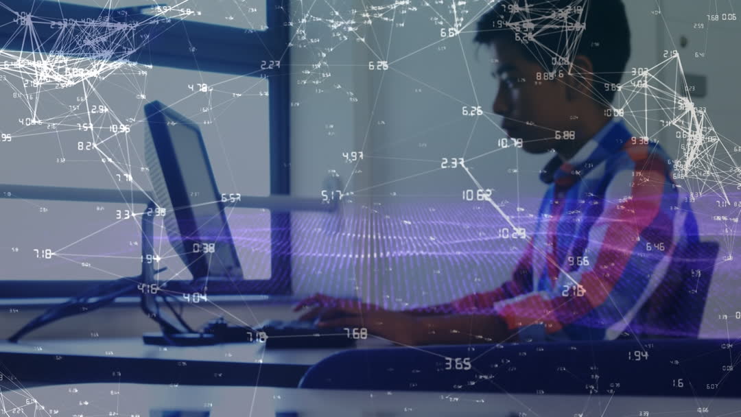 Young student sitting at desk, focused on computer screen as digital network lines connect across video, representing connectivity and modern technology in education. Ideal for illustrating concepts of technological literacy in schools, digital learning environments, and impacts of innovation on education systems.