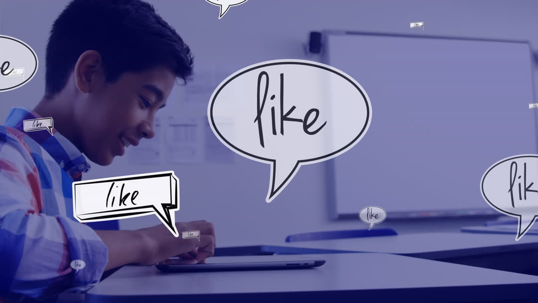 Indian boy in classroom using digital tablet surrounded by speech bubbles with the word 'like', symbolizing social media interaction and modern educational technology. Perfect for illustrating themes of digital learning, youth engagement with technology, or innovations in education.