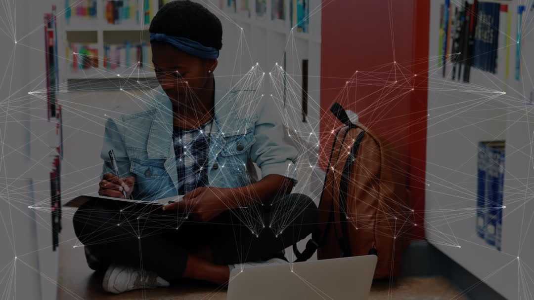 The scene shows an African American student sitting on the floor of a university library while engaged with a laptop and taking notes, overlayed with a network connect illustration. The digital network overlay symbolizes modern digital technology and the interconnected world of information in education. Perfect for use in educational materials, tech advertising, or articles about digital transformation in learning environments.