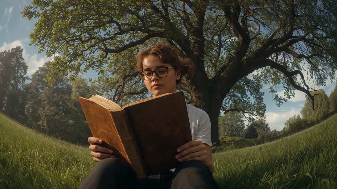 AI Generated Video. Young woman sitting on grassy slope under large oak tree, reading vintage leather book and turning pages slowly. Soft sunlight filtering through leaves, casting warm highlights and gentle shadows across meadow. Wide-angle perspective creating immersive foreground with sweeping grass and distant treeline. Scene suiting education, slow living, mindfulness, and study lifestyle projects. Placing text overlay on sky area, cropping for banner formats, and applying warm color grade for vintage look. Using for website hero, social media banner, blog header, book club promotion, library campaign, online course marketing, and editorial about reading habits and mental wellness. Frame presenting calm mood and timeless atmosphere for storytelling and commercial use.
