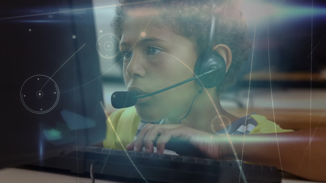 Young student wearing headset actively using computer. Digital graphics representing network connections overlayed. Perfect for illustrating modern education methods, technology integration in learning, and interactive school environments.