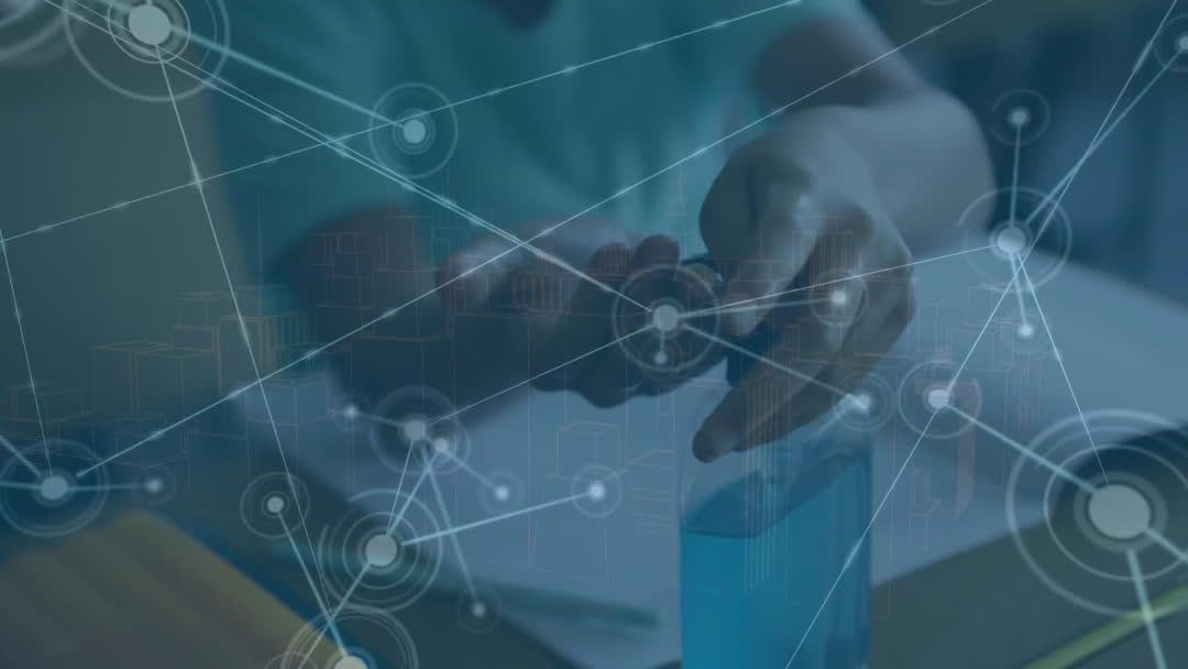 Student Using Sanitizer with Digital Network Overlay in Classroom Video
