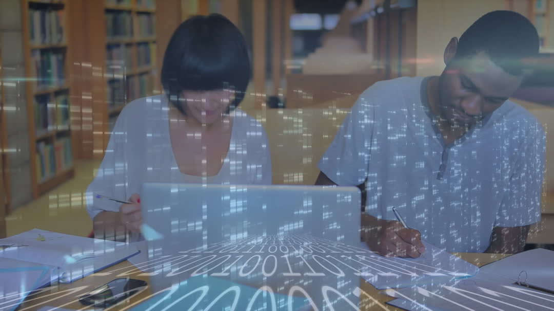 Young college students study together and use laptops in a library, with transparent overlay symbols of data processing and global technology concepts. Suitable for illustrating themes of education, digital literacy, teamwork, modern technology in academic settings, and global communication.