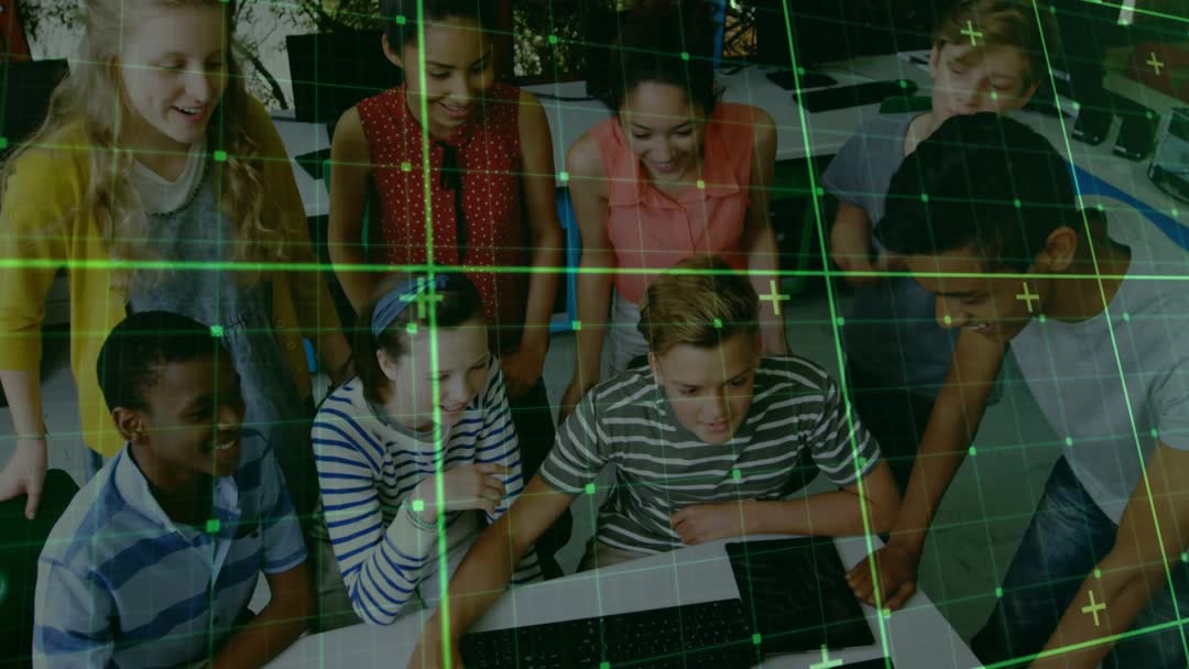 Group of diverse students gather around a computer, engaging in a digital lesson with green grid overlay emphasizing technological themes. Suitable for promoting educational tools, teamwork in classrooms, or advertising learning software focusing on collaborative projects and youth engagement.