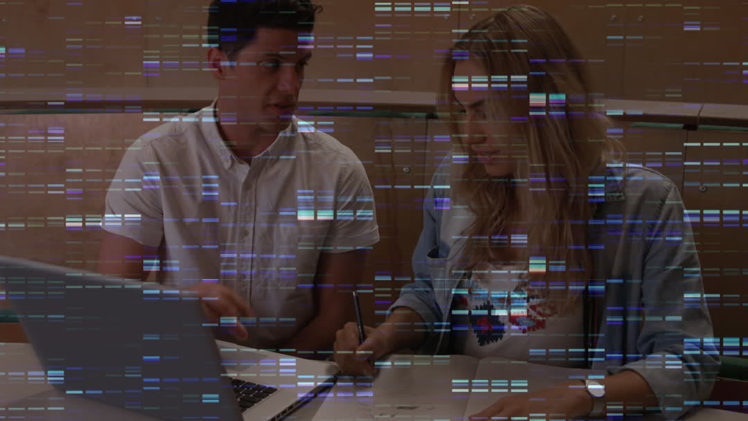 This visual depicts two students engaged in a collaborative DNA data analysis project on a laptop in a classroom setting, overlaid with a graphic interface coherent with genetic code analysis. Useful for illustrating modern technology use in education, teamwork in scientific research, and the digital study environments. Suitable for educational publications, academic websites, or technology research blogs highlighting STEM innovations.