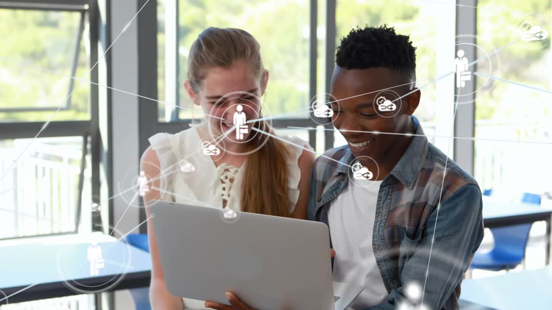 Students Collaborating on Laptop with Digital Network Overlay Video