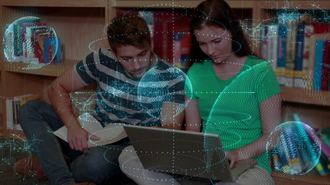 Two young adults sitting on floor between bookshelves, right student typing on laptop, left student pointing at open book. Holographic globe and swirling data rings overlaying scene, suggesting augmented learning, global research, and interactive study tools. Useful for promoting edtech platforms, online courses, campus marketing, library services, collaborative study apps, and corporate training materials. Use as hero background, explainer header, social media ad, or presentation opener; consider adding voiceover about digital learning and subtle ambient music to enhance futuristic atmosphere.
