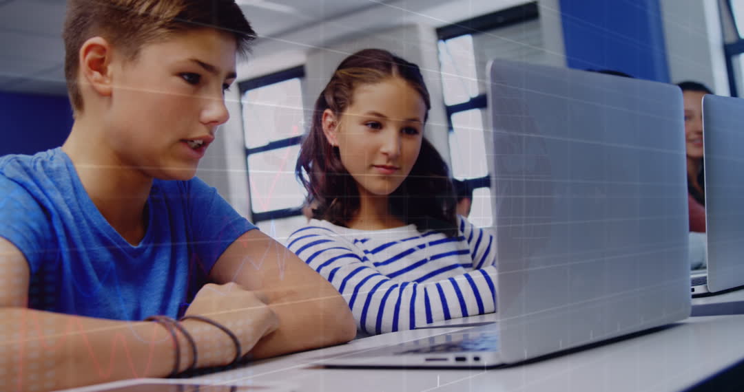 Young students engaged in collaborative learning using laptops in a modern classroom environment, with a digital stock trading interface superimposed, symbolizing the intersection of education and modern technology. This visual can be used by educational technology marketers to showcase innovative learning tools, while finance educational platforms can illustrate the concept of integrating financial literacy in school curriculums.