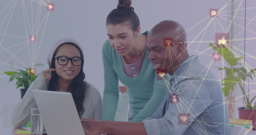 Young female students study together using laptop. Digital network overlays connect various icons, emphasizing collaborative technology use and innovative learning. Ideal for educational content, teamwork projects, and network visualization demonstrations.