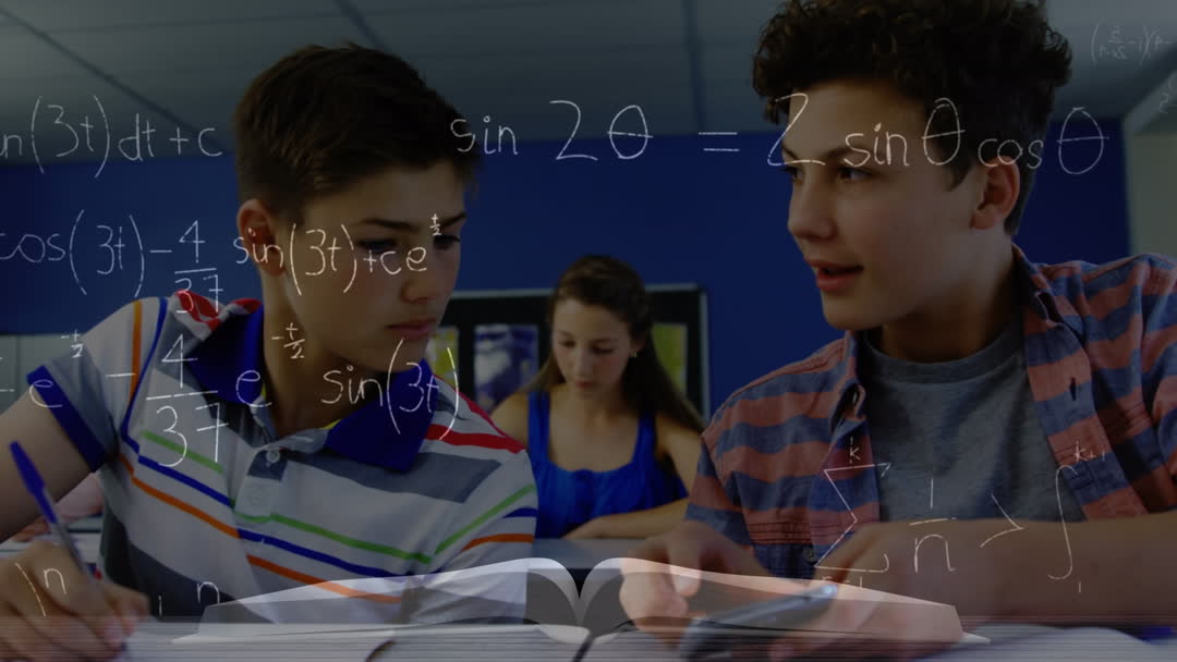 Teenage students engaged in discussion during a math class, with animated mathematical formulas overlaid. This can be used for educational content, back-to-school promotions, or materials intended to depict school life and the learning process.