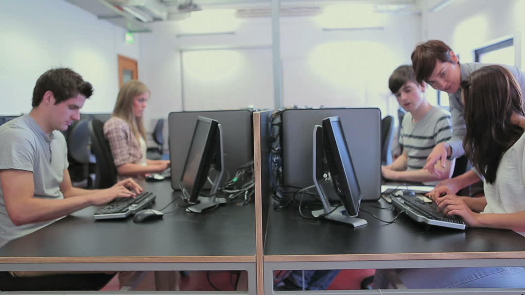 Group of students working on computers in a lab while a teacher assists, emphasizing collaborative learning and educational engagement. Ideal for illustrating concepts related to modern education, technology-enabled learning, and teamwork in classroom settings.