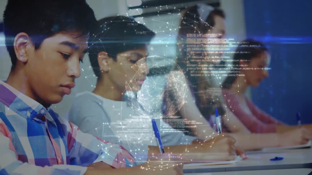 Image depicts students writing attentively at their desks with high-tech overlays of network nodes and code, suggesting a modern and innovative learning atmosphere. Ideal for materials discussing advancements in educational technology, digital classrooms, and the integration of technology into learning systems.
