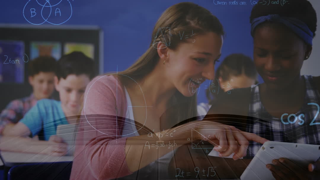 Happy male and female students actively engaged with a digital tablet in a classroom setting, enhancing interactive learning. The mathematical equations overlay suggests a focused environment conducive for STEM education. Ideal for educational materials, technology integration in education platforms, and promoting collaborative learning tools.