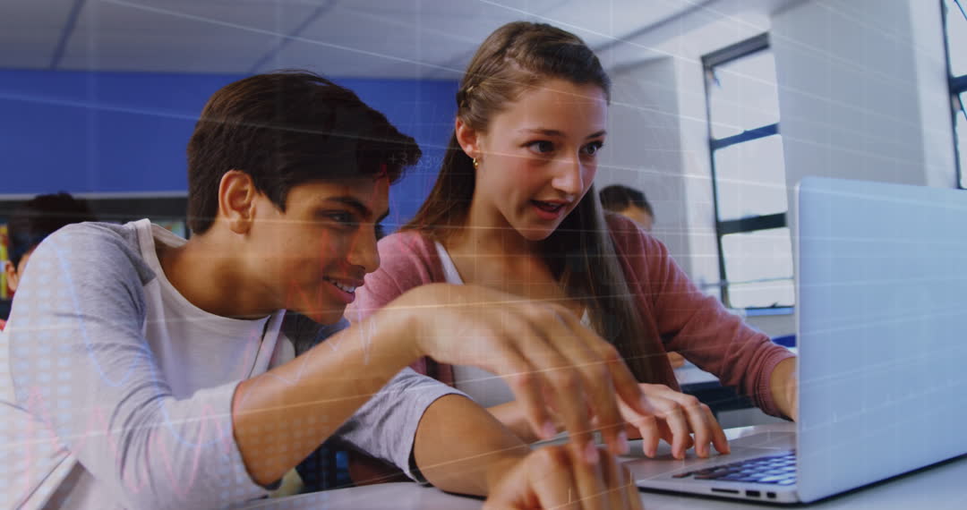 Multiracial students actively exploring educational content on a laptop in classroom, superimposed with a financial trading board and graph. Represents blend of modern technology, education, and financial understanding. Ideal for use in educational resources, technology tools marketing, e-learning platforms, and illustrating tech-driven learning environments.