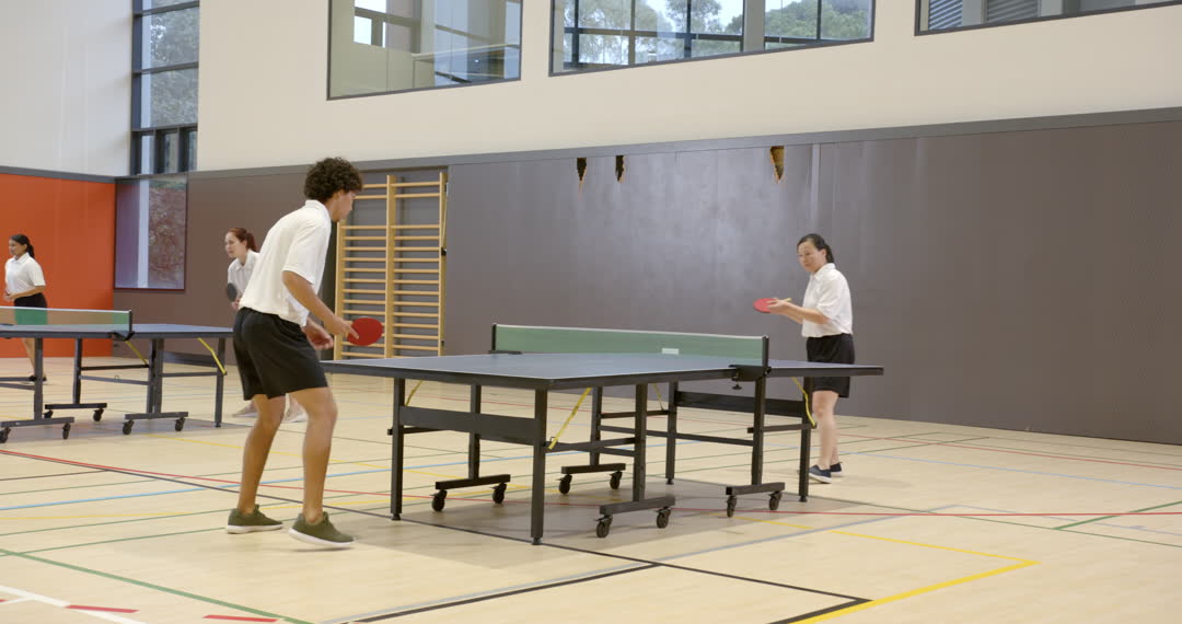 Students participating in a lively table tennis game within a school gym. Perfect for illustrating school sports programs, physical activity promotion, and team-building exercises among students. Useful for educational materials, sports community outreach, or healthy lifestyle campaigns emphasizing youth involvement in athletic activities.