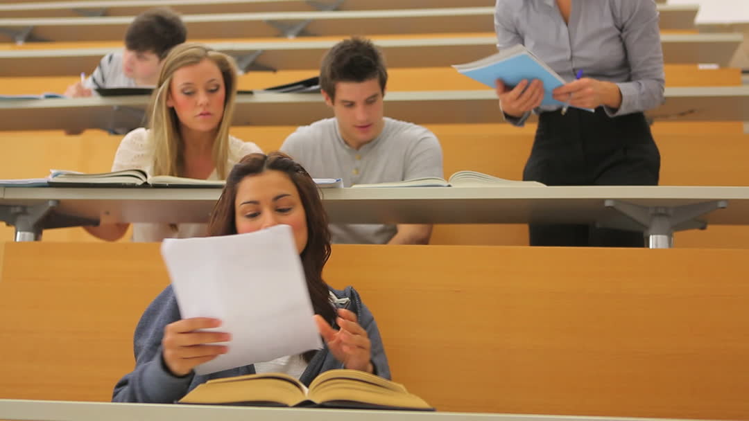 This scene depicts a lively moment in a college lecture hall, where a female professor is actively engaging with students. They are interacting, reading from textbooks, and taking notes, suggesting a dynamic educational environment. This video is ideal for depicting higher learning concepts, team collaborative interaction, or university promotional material.