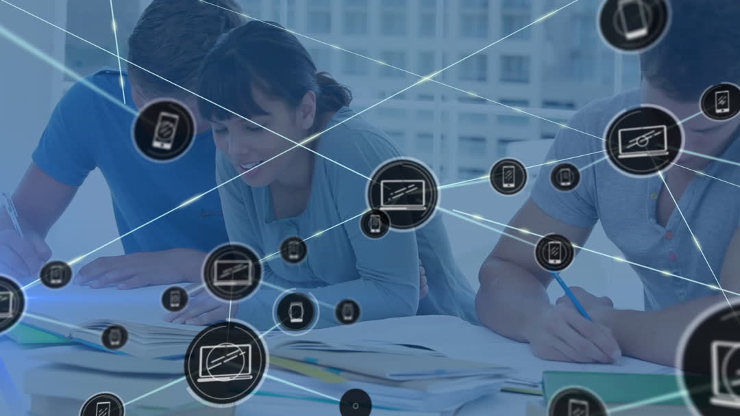 Animated overlay of technological contact icons connected by network lines over a group of students focusing on studies. Represents global connectivity in education, digital networking, and integration of technology in learning environments. Ideal for use in online learning materials, technology in education initiatives, network outreach programs, or promotional materials for academic technology solutions.