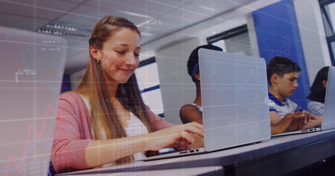A diverse group of students using laptops in a classroom setting, overlaid with animation of trading data and charts. This suggests concepts of digital education and investment in future learning. Ideal for illustrating topics related to e-learning, educational technology, digital classrooms, global education, and financial literacy lessons in a tech-savvy environment.