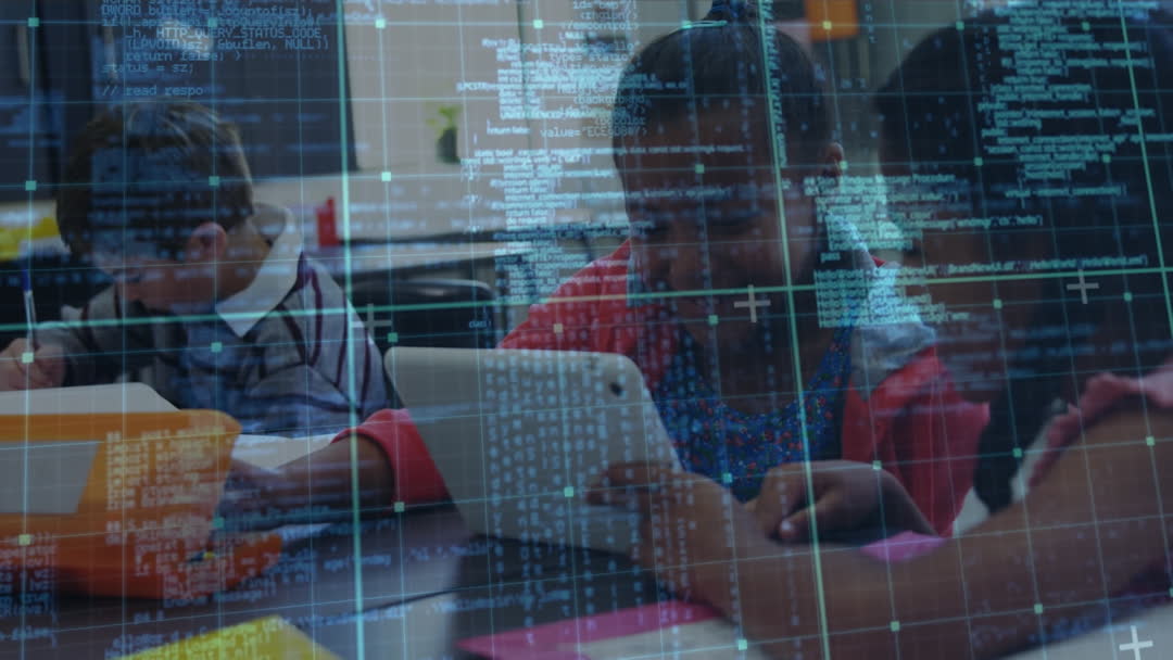 This depicts students in a classroom using tablets, suggesting the integration of modern technology into education. Layers of data processing and digital coding text symbolize the intersection of learning and digital skills. This serves well for illustrating educational transformation, use of technology in schools, or e-learning projects.
