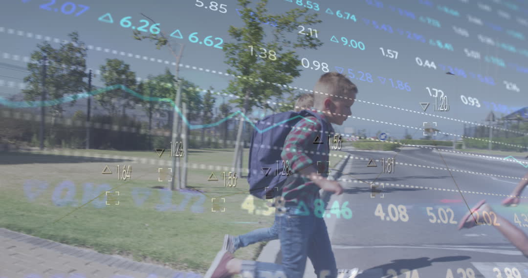 Childhood meets high finance as students run across a zebra crossing with an overlay of stock market charts. This visual blend signifies the interconnectedness of education and financial futures or concepts of learning in a globalized economy. Suitable for articles related to financial literacy, education themes, the impact of economics on families, or creating awareness about children’s safety intertwined with future planning.