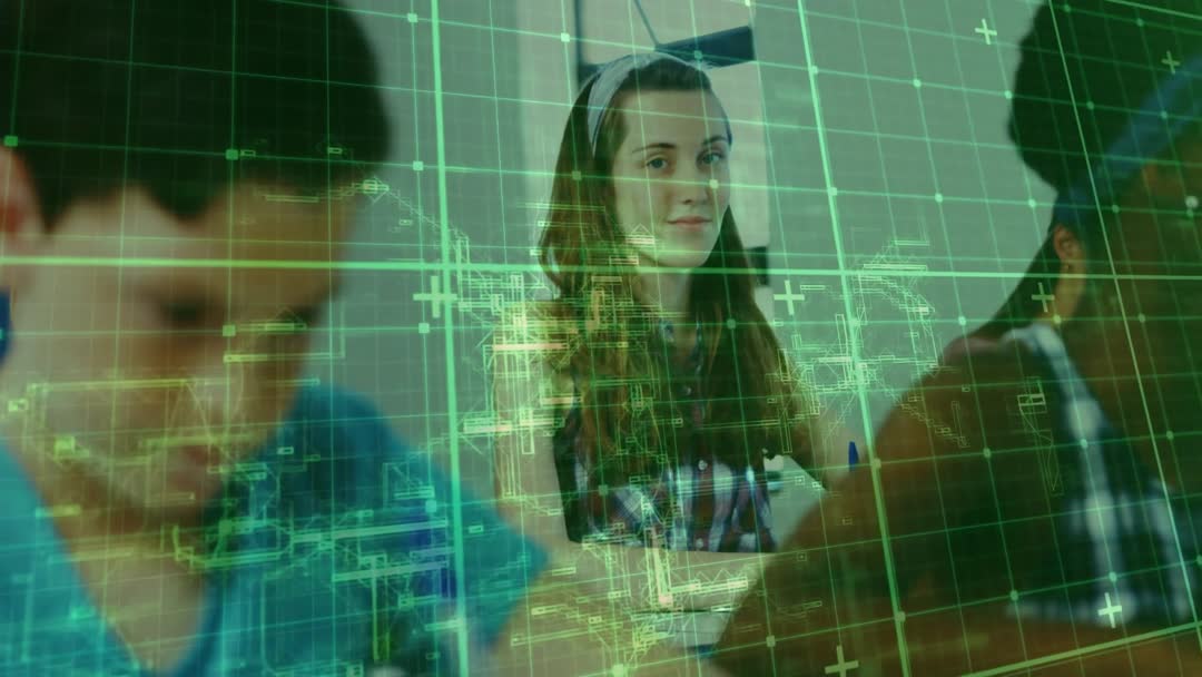 Students in Classroom with Futuristic Digital Overlay Video