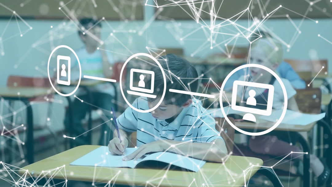 Image shows students in a classroom engaged with education technology, depicting interconnected learning through digital networks. Suitable for illustrating modern educational methods, online learning platforms, or advancing technology in education.