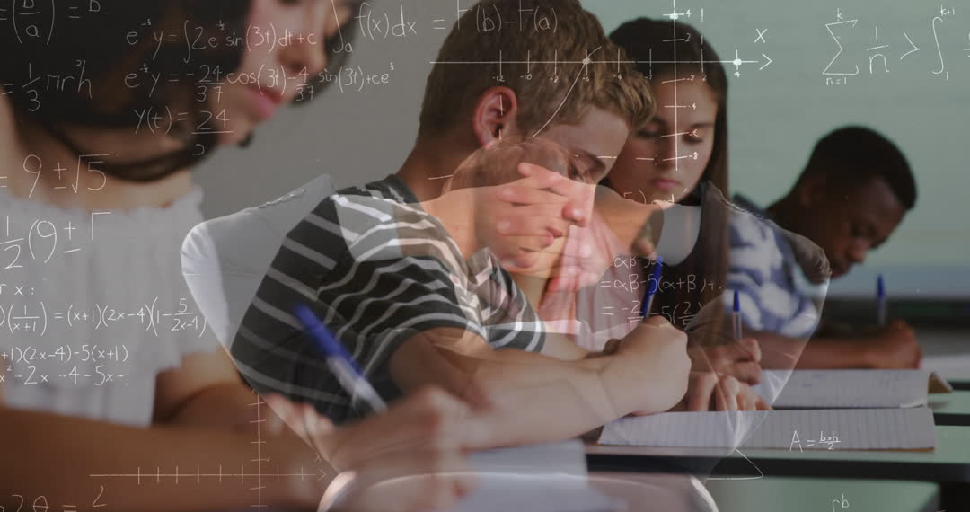 Diverse group of students deeply engaged in studying mathematics with dynamic math formulas overlaying their activity. Ideal for illustrating education themes, digital learning tools, classroom dynamics, multicultural teaching environments, and the integration of technology in modern education.