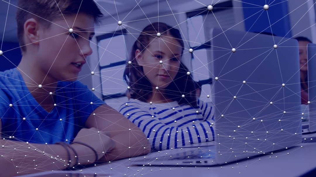 Young students sitting in a classroom engage with digital tech on laptops, depicted through a visual web of connections. This videory symbolizes innovation and modern educational experiences enhanced by technology. Perfect for articles or presentations on advances in educational technology, online learning, or the importance of digital literacy.