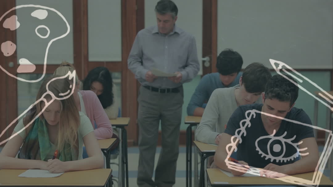 Students Taking Exam with Animated School Icons Overlay Digitally Generated Video