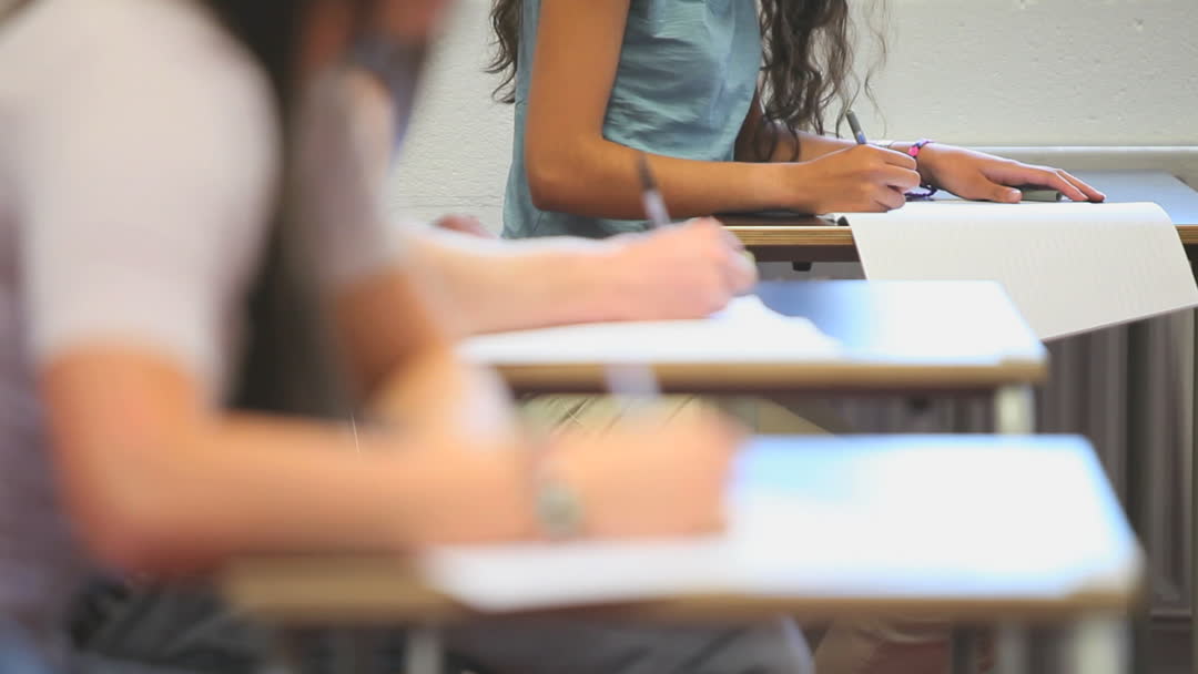 Students writing at desks in a classroom, providing a focused atmosphere for educational content. Ideal for use in education blogs, academic resource materials, or online articles about study methods and classroom environments.