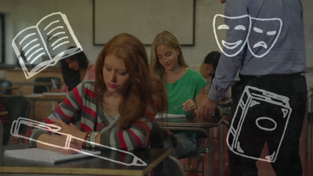 Students Taking Notes in Classroom with Educational Icons Overlay Video