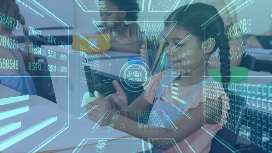 Scene captures children in classroom engaging with tablets displaying augmented reality graphs and data. Motion and interaction with AR technology enhance learning experience, promoting digital literacy and engaging teaching methods. Ideal for illustrating educational advancements, showcasing modern classrooms' tech integration, or digital content focused on educational technology evolution.