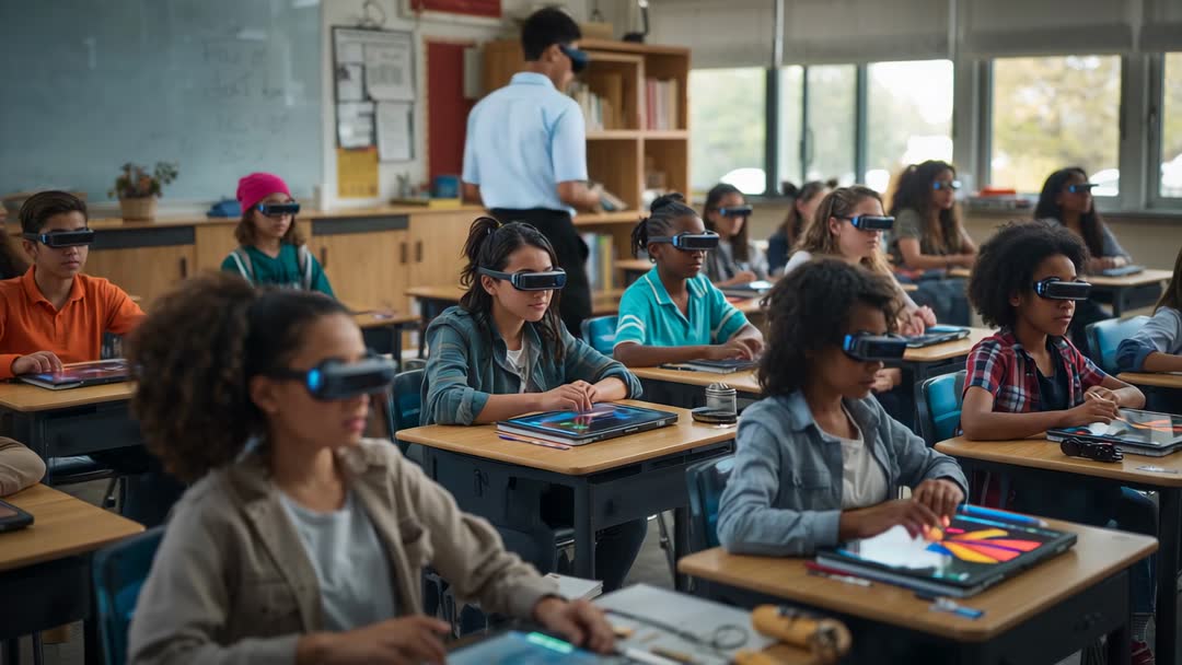 AI Generated Image. Frame showing middle school classroom where students wearing VR headsets and tapping tablets while teacher walking down aisle. Multicultural group of students engaging with immersive digital lesson in daylight-filled classroom. Useful for edtech marketing, e-learning platform demos, teacher training videos, school websites, education conference presentations, and articles about VR in education. Ideal for hero banners, social media ads, slideshow backgrounds, instructional course materials, and annual reports. Crop options include close-up on tablet screen to highlight app interface or mid-shot showing teacher interaction to emphasize classroom flow. Add text overlay, headline, and call-to-action for promotional use. Color grade to warm tones to enhance daylight mood. Suitable for commercial and editorial licensing across education and technology projects.
